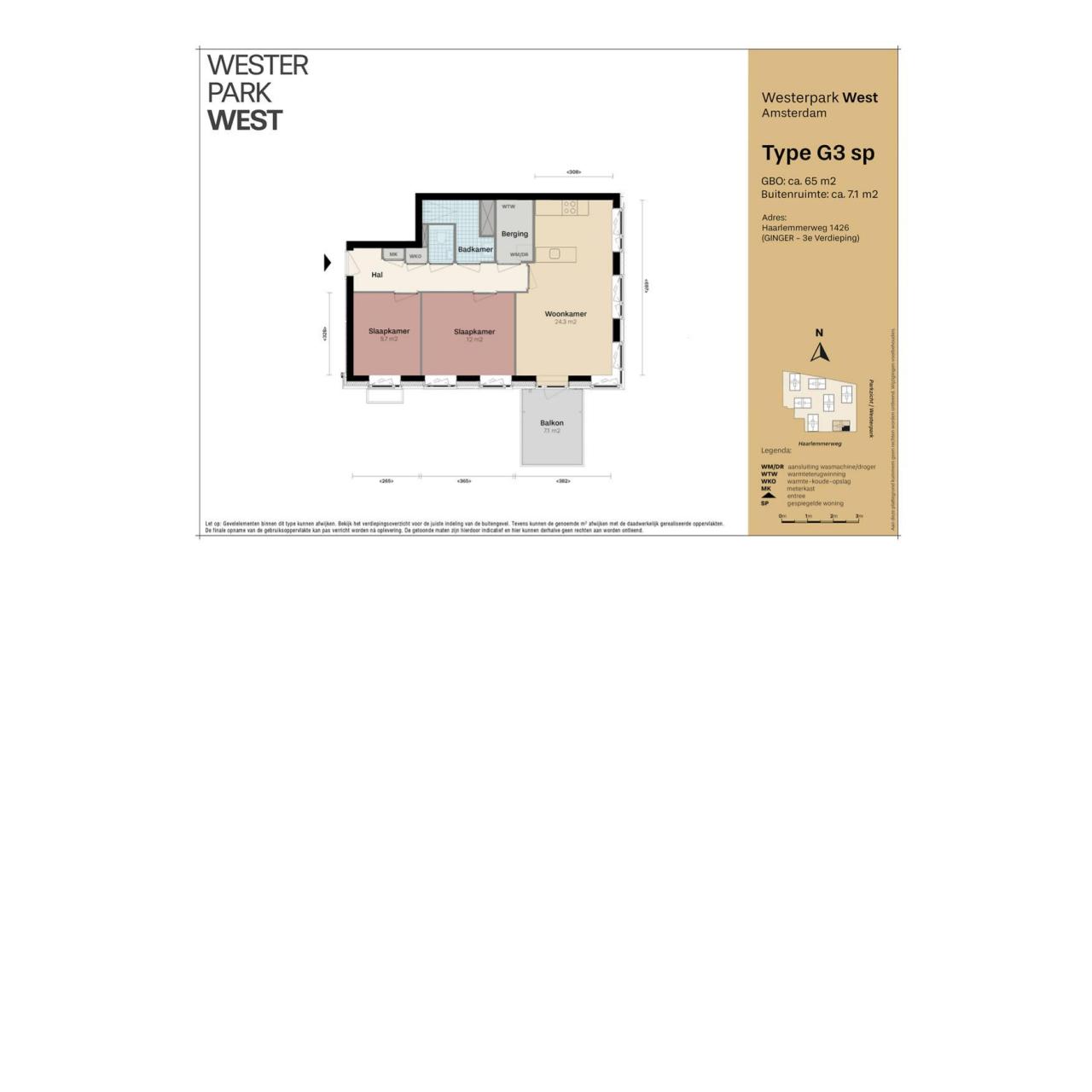 Dit ruime 3-kamerappartement van ca. 65 m² is gelegen op de 3e verdieping in Gebouw Ginger. De woning beschikt over een lichte woonkamer met open keuken, twee slaapkamers, een interne berging en een fijne buitenruimte op het noordwesten.