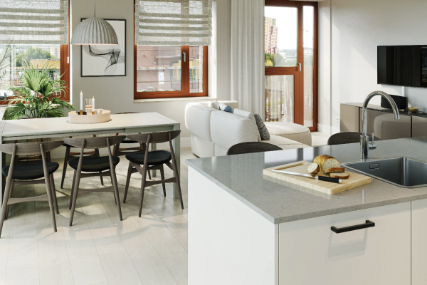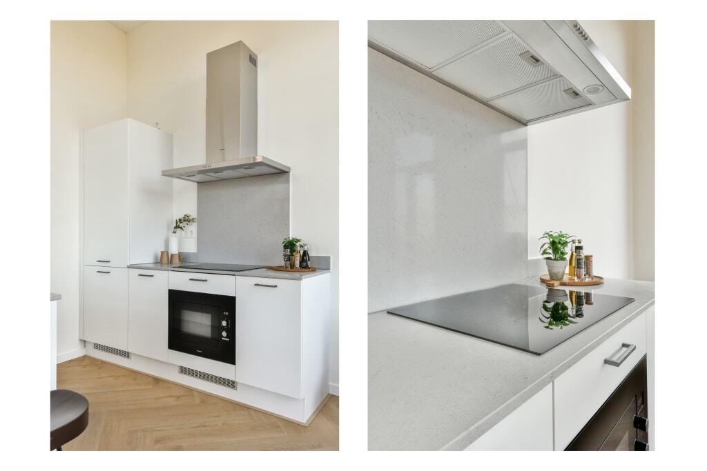 The white kitchen with cooking island is fully equipped with built-in appliances: fridge-freezer, extractor hood, combination microwave, induction hob, and dishwasher. The ideal place where cooking and conviviality come together.