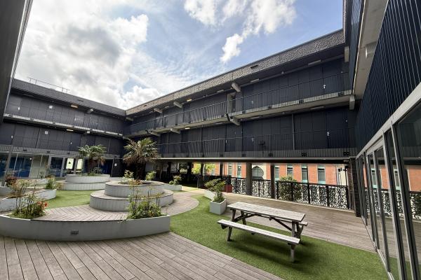 Het gebouw heeft een atrium waar je kunt werken en genieten van een snack uit de automaten. Naast het atrium ligt de gemeenschappelijke woonkamer, die uitnodigt om te ontspannen, een film te kijken of een spelletje te spelen met je medebewoners.
