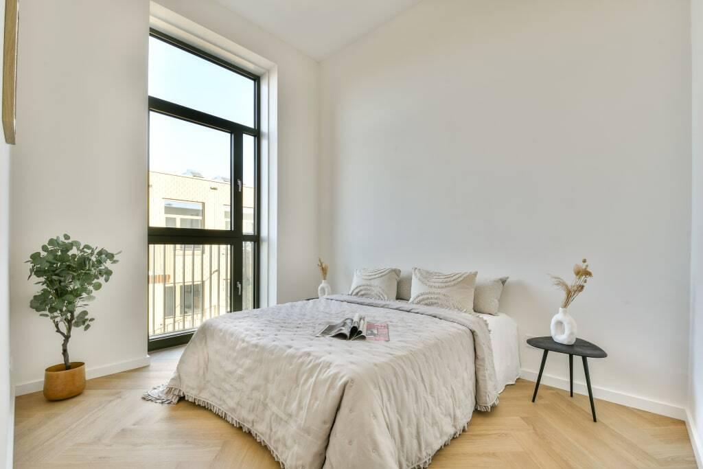 The residence will be delivered with PVC floors, and the walls are covered with white scan wallpaper and will be painted white.