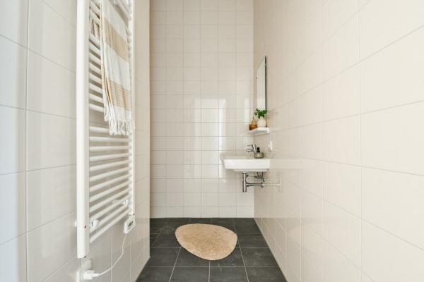 The bathroom is completely finished and includes a walk-in shower, a washbasin with a mirror, and a towel radiator. Additionally, there is a separate toilet with a small sink (fountain).